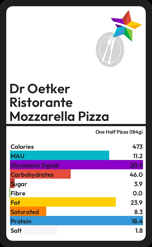 Dr Oetker Ristorante Mozzarella Pizza contains 3.9g sugar in one Half Pizza (184g) - that is around 1 cube of sugar.
