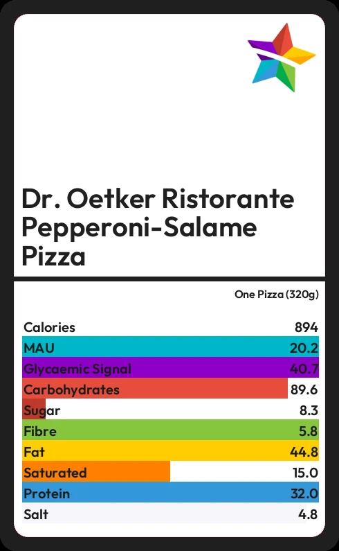 Dr. Oetker Ristorante Pepperoni-Salame Pizza contains 8.3g sugar in one Pizza (320g) - that is around 2 cubes of sugar.