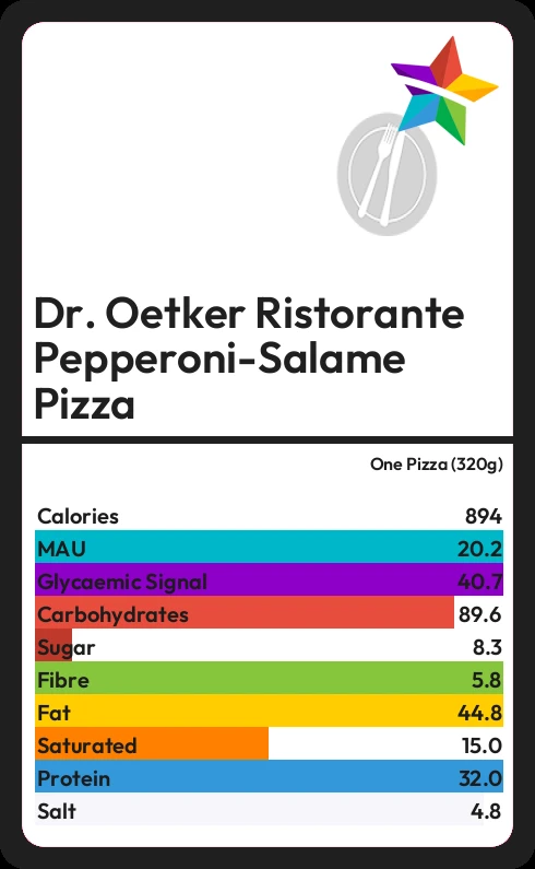 Dr. Oetker Ristorante Pepperoni-Salame Pizza contains 8.3g sugar in one Pizza (320g) - that is around 2 cubes of sugar.