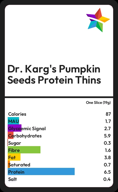 Dr. Karg's Pumpkin Seeds Protein Thins contains 0.3g sugar in one Slice (19g)