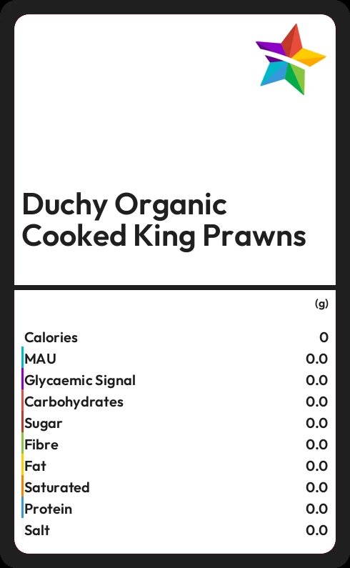 Duchy Organic Cooked King Prawns contains 0.5g sugar in 100g