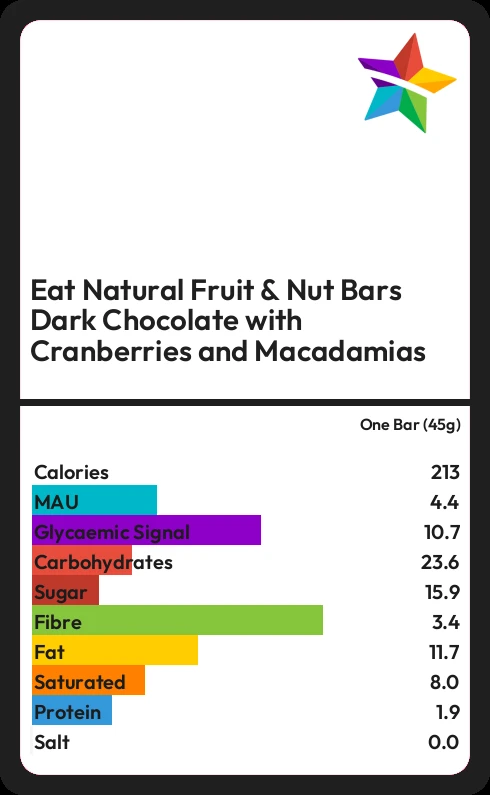Eat Natural Fruit & Nut Bars Dark Chocolate with Cranberries and Macadamias contains 15.9g sugar in one Bar (45g) - that is around 4 cubes of sugar.