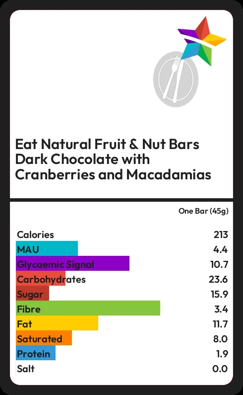 Eat Natural Fruit & Nut Bars Dark Chocolate with Cranberries and Macadamias contains 213.3 calories in one Bar (45g).