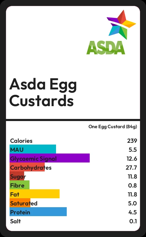 Asda Egg Custards contains 239.4 calories in one Egg Custard (84g).