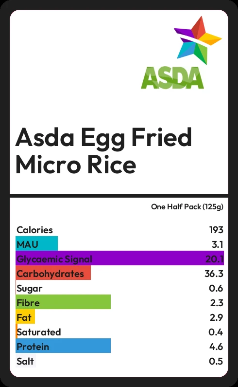 Asda Egg Fried Micro Rice contains 0.6g sugar in one Half Pack (125g)