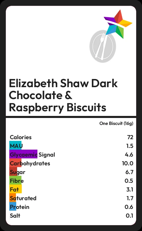 Elizabeth Shaw Dark Chocolate & Raspberry Biscuits contains 72 calories in one Biscuit (16g).