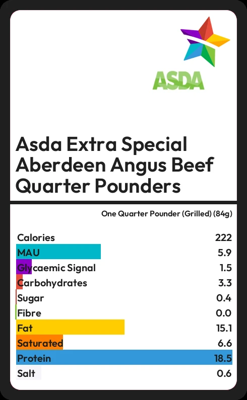 Asda Extra Special Aberdeen Angus Beef Quarter Pounders contains 0.4g sugar in one Quarter Pounder (Grilled) (84g)