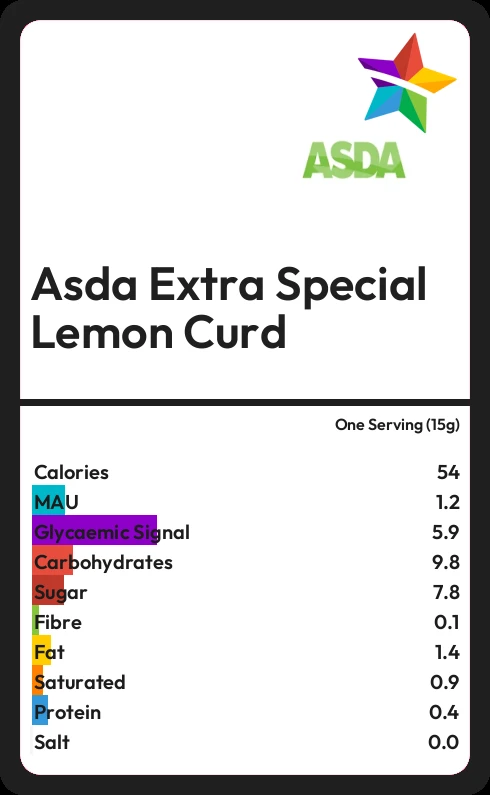 Asda Extra Special Lemon Curd contains 53.7 calories in one Serving (15g).