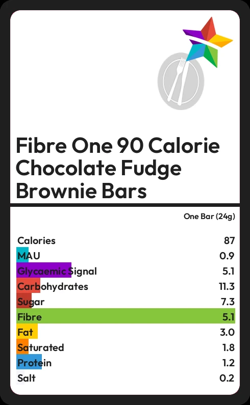 Fibre One 90 Calorie Chocolate Fudge Brownie Bars contains 7.3g sugar in one Bar (24g) - that is around 2 cubes of sugar.