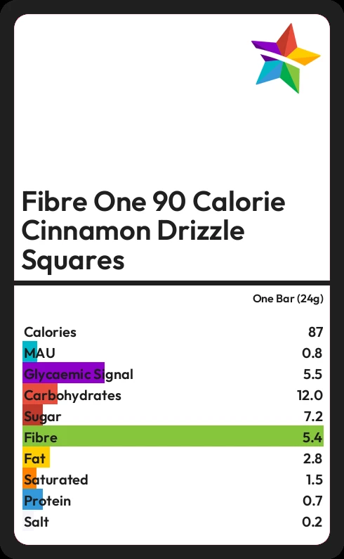 Fibre One 90 Calorie Cinnamon Drizzle Squares contains 86.9 calories in one Bar (24g).
