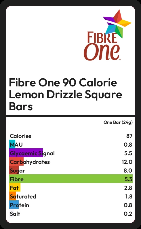 Fibre One 90 Calorie Lemon Drizzle Square Bars contains 86.9 calories in one Bar (24g).