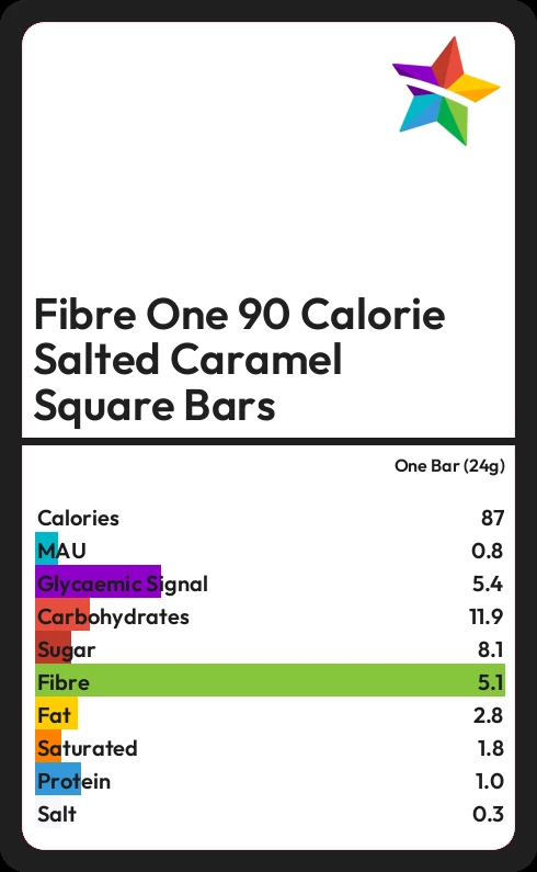 Fibre One 90 Calorie Salted Caramel Square Bars contains 86.6 calories in one Bar (24g).