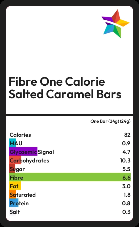 Fibre One Calorie Salted Caramel Bars contains 81.8 calories in one Bar (24g) (24g).