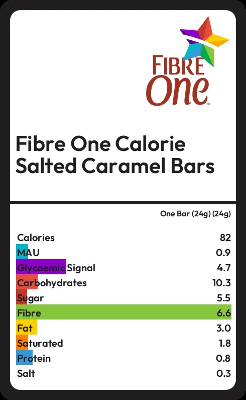 Fibre One Calorie Salted Caramel Bars contains 81.8 calories in one Bar (24g) (24g).
