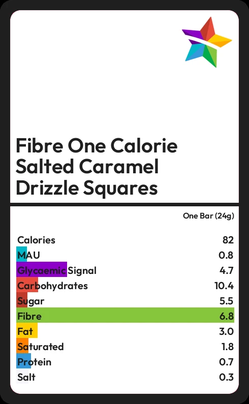 Fibre One Calorie Salted Caramel Drizzle Squares contains 82.3 calories in one Bar (24g).