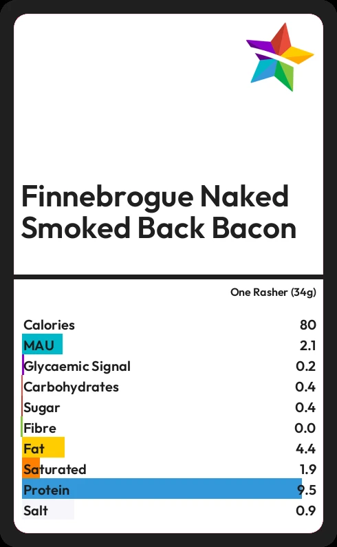 Finnebrogue Naked Smoked Back Bacon contains 80.6 calories in one Rasher (34g).