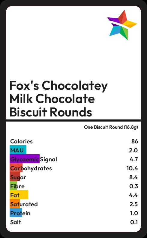 Fox's Chocolatey Milk Chocolate Biscuit Rounds contains 86 calories in one Biscuit Round (16.8g).