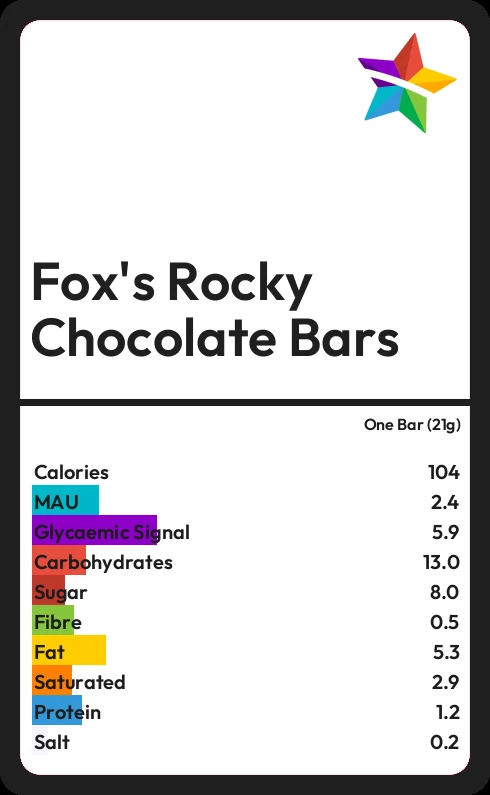 Fox's Rocky Chocolate Bars contains 104 calories in one Bar (21g).