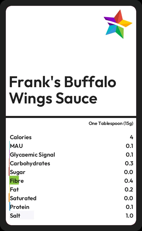 Frank's Buffalo Wings Sauce contains 4.4 calories in one Tablespoon (15g).