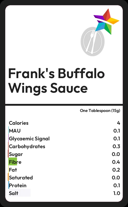 Frank's Buffalo Wings Sauce contains 4.4 calories in one Tablespoon (15g).