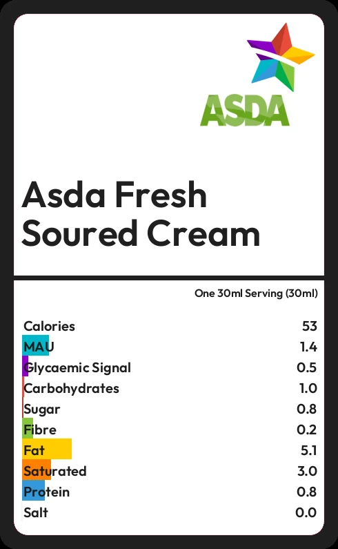 Asda Fresh Soured Cream contains 0.8g sugar in one 30ml Serving (30ml)