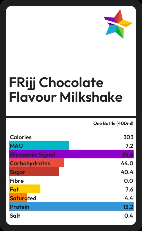 FRijj Chocolate Flavour Milkshake contains 304 calories in one Bottle (400ml).