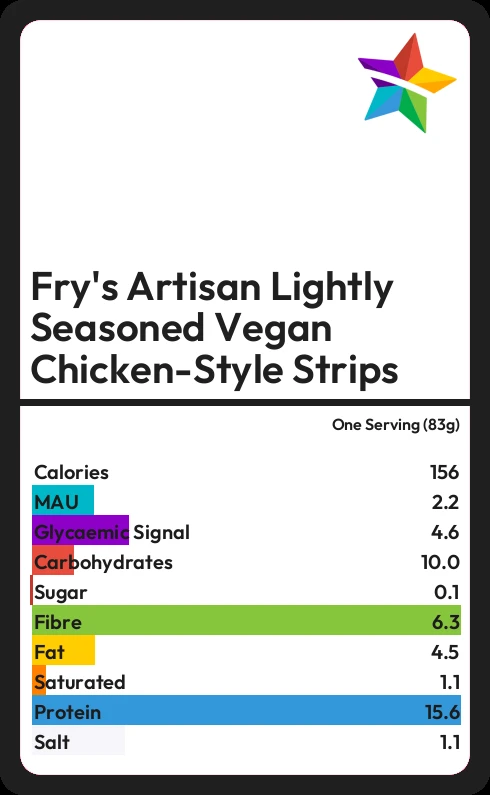 Fry's Artisan Lightly Seasoned Vegan Chicken-Style Strips contains 156 calories in one Serving (83g).