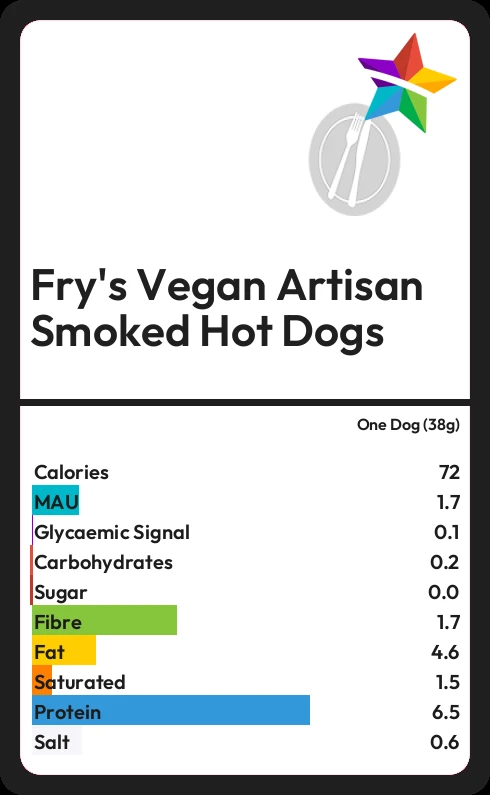 Fry's Vegan Artisan Smoked Hot Dogs contains no sugar in one Dog (38g)