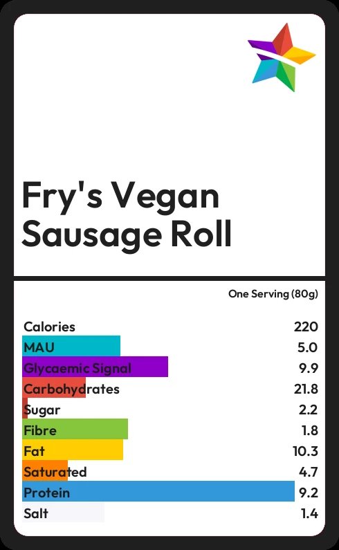Fry's Vegan Sausage Roll contains 220 calories in one Serving (80g).