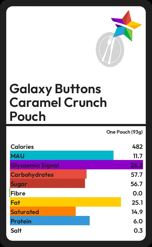 Galaxy Buttons Caramel Crunch Pouch contains 56.7g sugar in one Pouch (93g) - that is around 14 cubes of sugar.