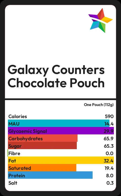 Galaxy Counters Chocolate Pouch contains 65.3g sugar in one Pouch (112g) - that is around 16 cubes of sugar.