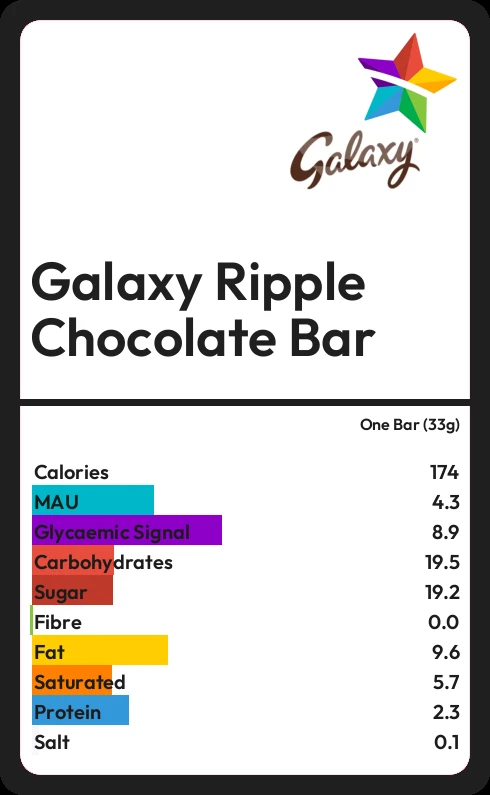 Galaxy Ripple Chocolate Bar contains 174.6 calories in one Bar (33g).