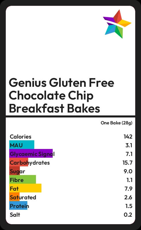 Genius Gluten Free Chocolate Chip Breakfast Bakes contains 9.0g sugar in one Bake (28g) - that is around 2 cubes of sugar.