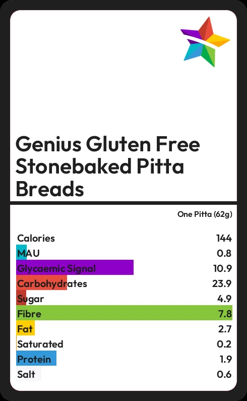 Genius Gluten Free Stonebaked Pitta Breads contains 143.8 calories in one Pitta (62g).