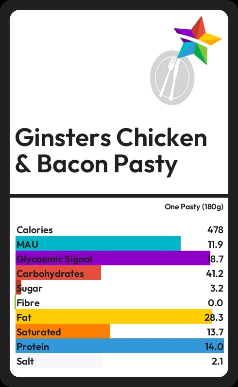 Ginsters Chicken & Bacon Pasty contains 3.2g sugar in one Pasty (180g) - that is around 1 cube of sugar.