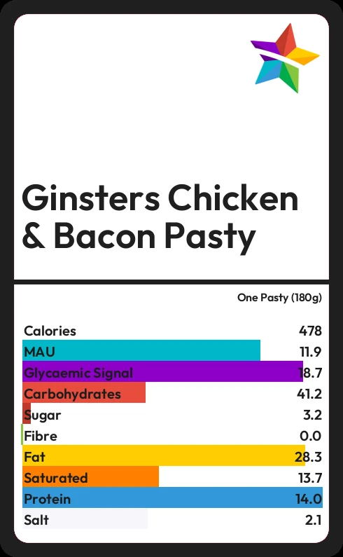 Ginsters Chicken & Bacon Pasty contains 3.2g sugar in one Pasty (180g) - that is around 1 cube of sugar.