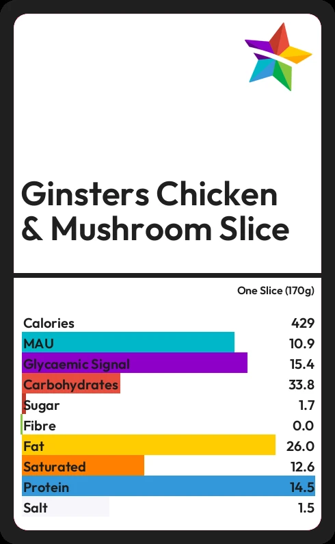 Ginsters Chicken & Mushroom Slice contains 1.7g sugar in one Slice (170g)