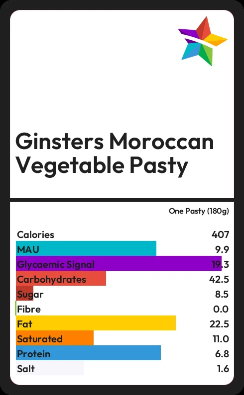 Ginsters Moroccan Vegetable Pasty contains 406.8 calories in one Pasty (180g).