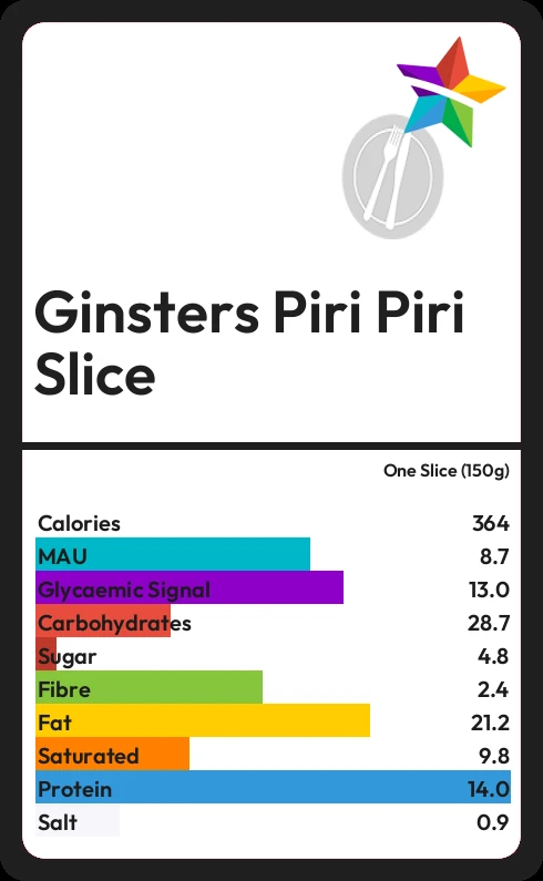 Ginsters Piri Piri Slice contains 364.5 calories in one Slice (150g).