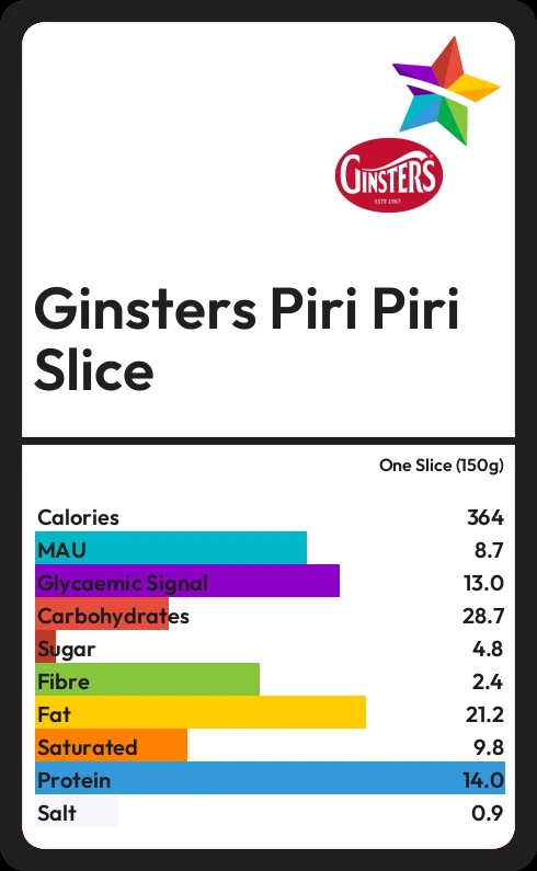 Ginsters Piri Piri Slice contains 364.5 calories in one Slice (150g).