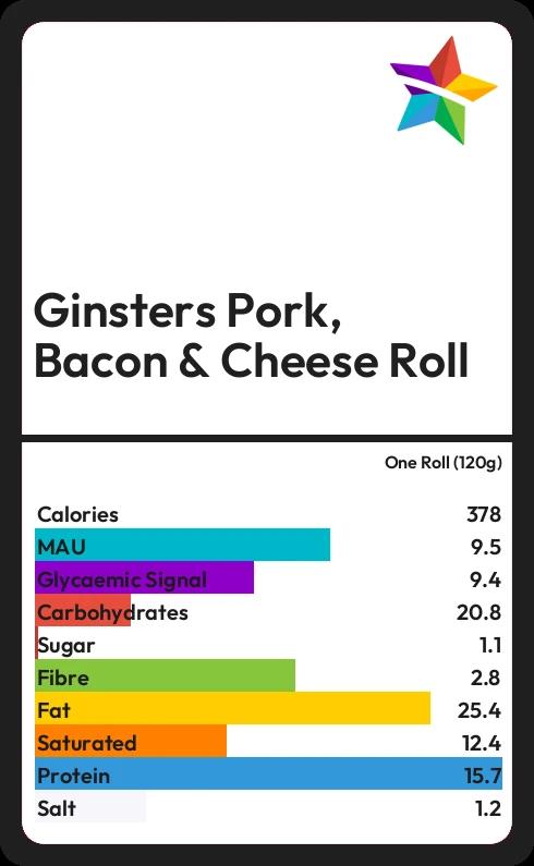 Ginsters Pork, Bacon & Cheese Roll contains 378 calories in one Roll (120g).