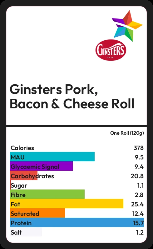 Ginsters Pork, Bacon & Cheese Roll contains 378 calories in one Roll (120g).