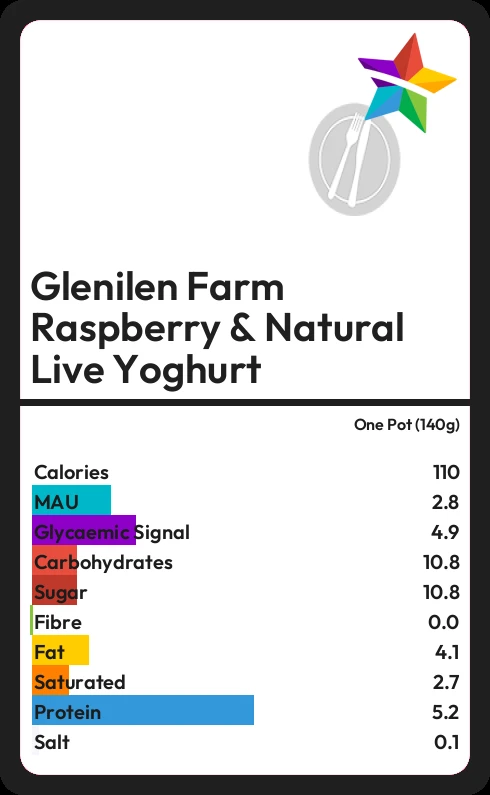 Glenilen Farm Raspberry & Natural Live Yoghurt contains 110.6 calories in one Pot (140g).