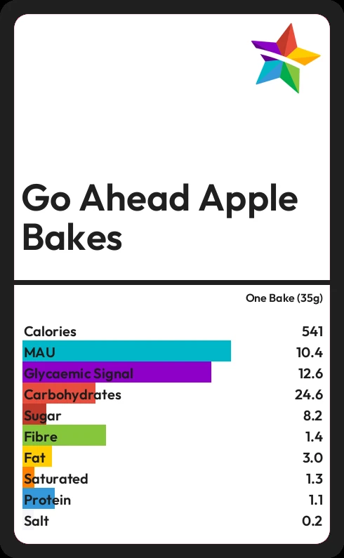 Go Ahead Apple Bakes contains 8.2g sugar in one Bake (35g) - that is around 2 cubes of sugar.