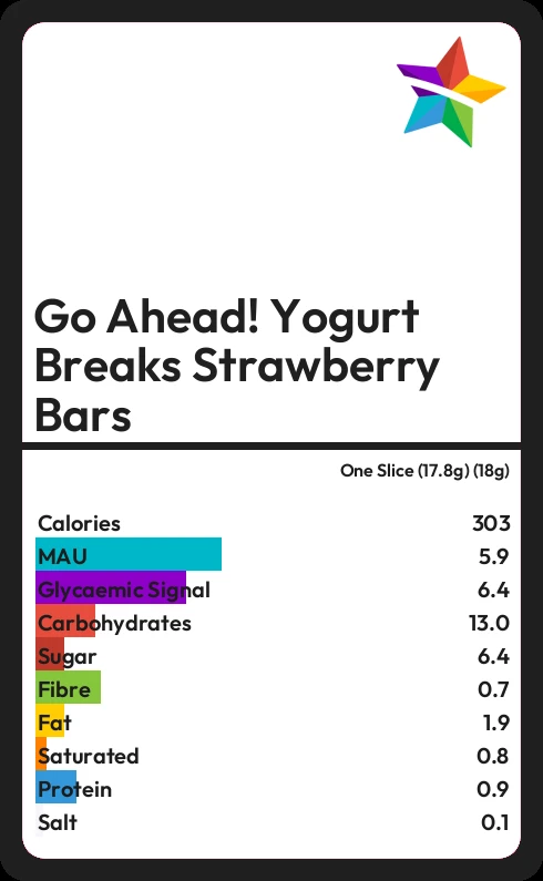 Go Ahead! Yogurt Breaks Strawberry Bars contains 6.4g sugar in one Slice (17.8g) (18g) - that is around 2 cubes of sugar.