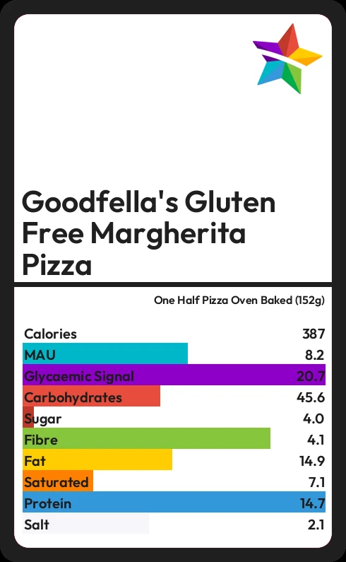 Goodfella's Gluten Free Margherita Pizza contains 387.6 calories in one Half Pizza Oven Baked (152g).
