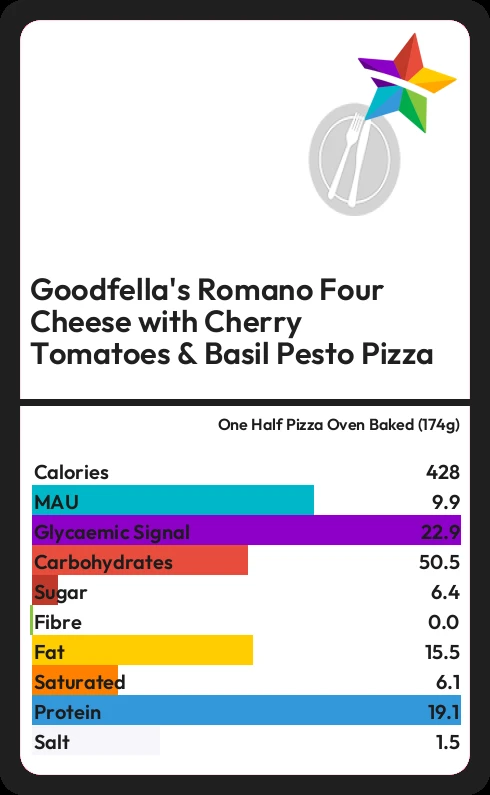 Goodfella's Romano Four Cheese with Cherry Tomatoes & Basil Pesto Pizza contains 6.4g sugar in one Half Pizza Oven Baked (174g) - that is around 2 cubes of sugar.