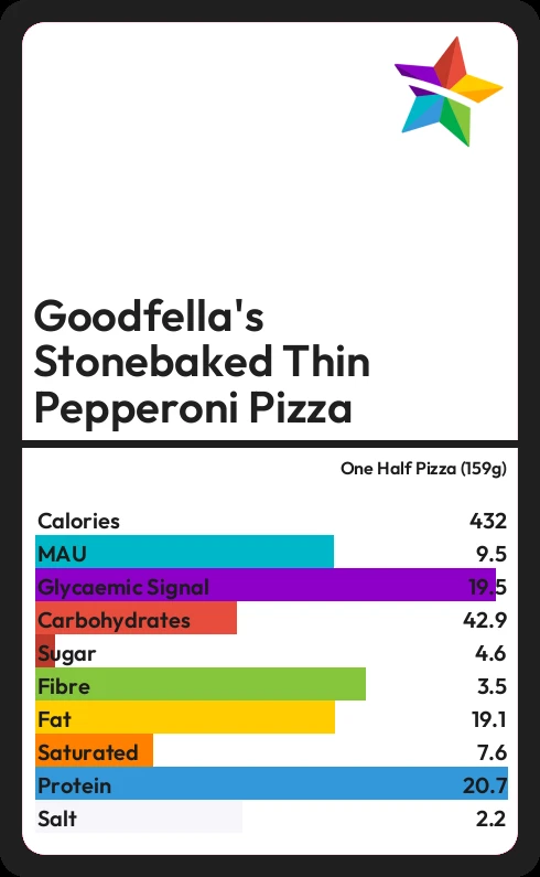 Goodfella's Stonebaked Thin Pepperoni Pizza contains 432.5 calories in one Half Pizza (159g).