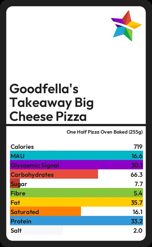 Goodfella's Takeaway Big Cheese Pizza contains 719.1 calories in one Half Pizza Oven Baked (255g).