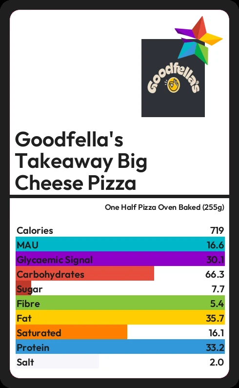 Goodfella's Takeaway Big Cheese Pizza contains 719.1 calories in one Half Pizza Oven Baked (255g).